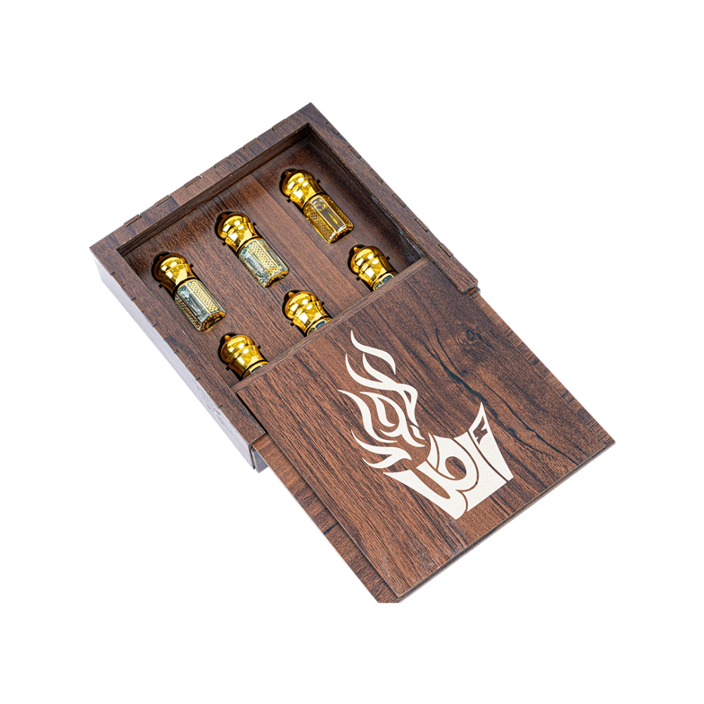 فهي فخامة تتكلم عن نفسها علبة خشب بتصميم عربي أصيل، و بداخلها 6 زجاجات مسك معروفة بروائح متنوعة وغنيّة.